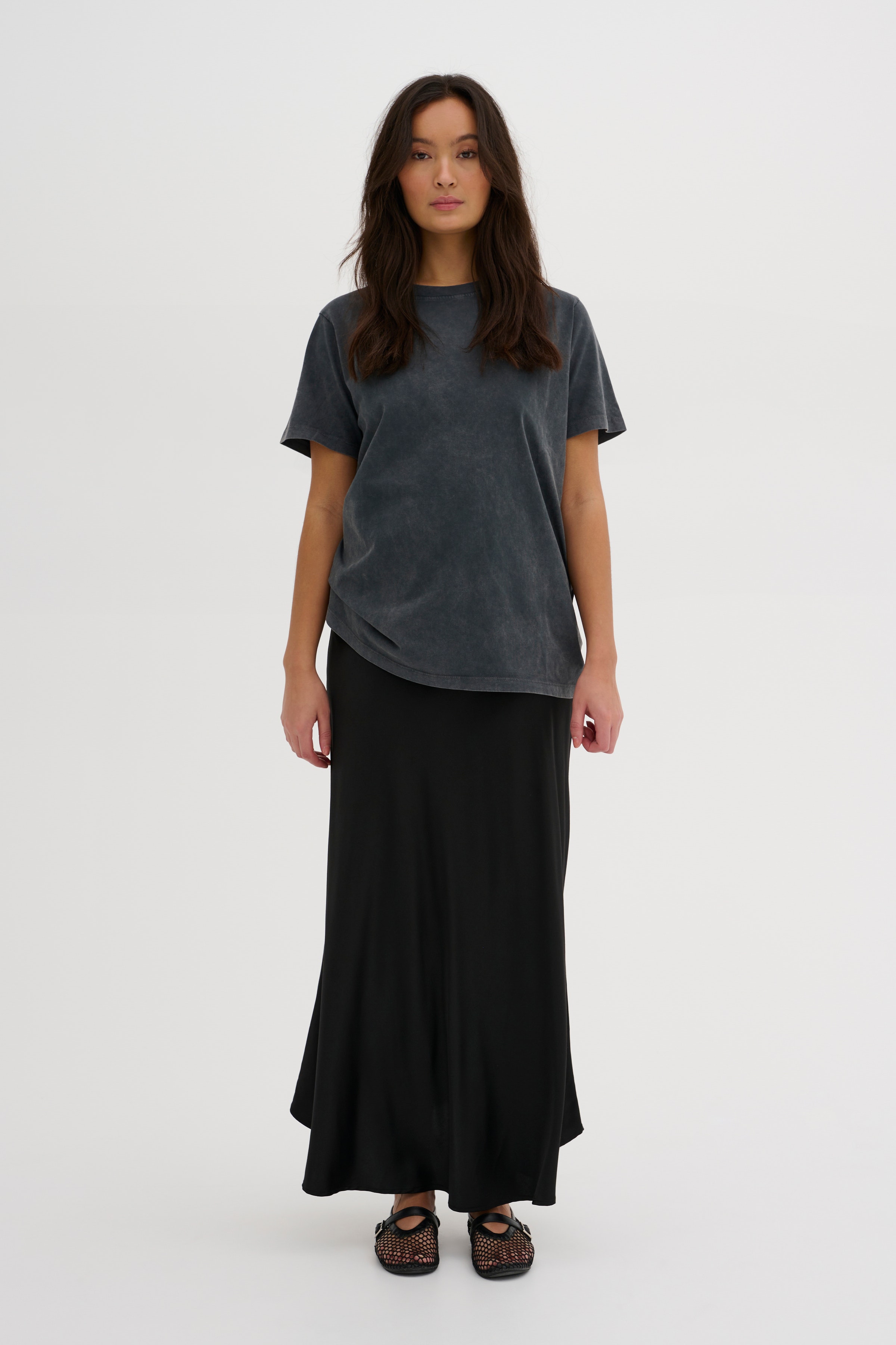 Satin-Maxirock mit fliessender Silhouette, dezent ausgestellt und glatter Oberfläche. Schmaler Bund, volle Länge und Reissverschluss hinten.